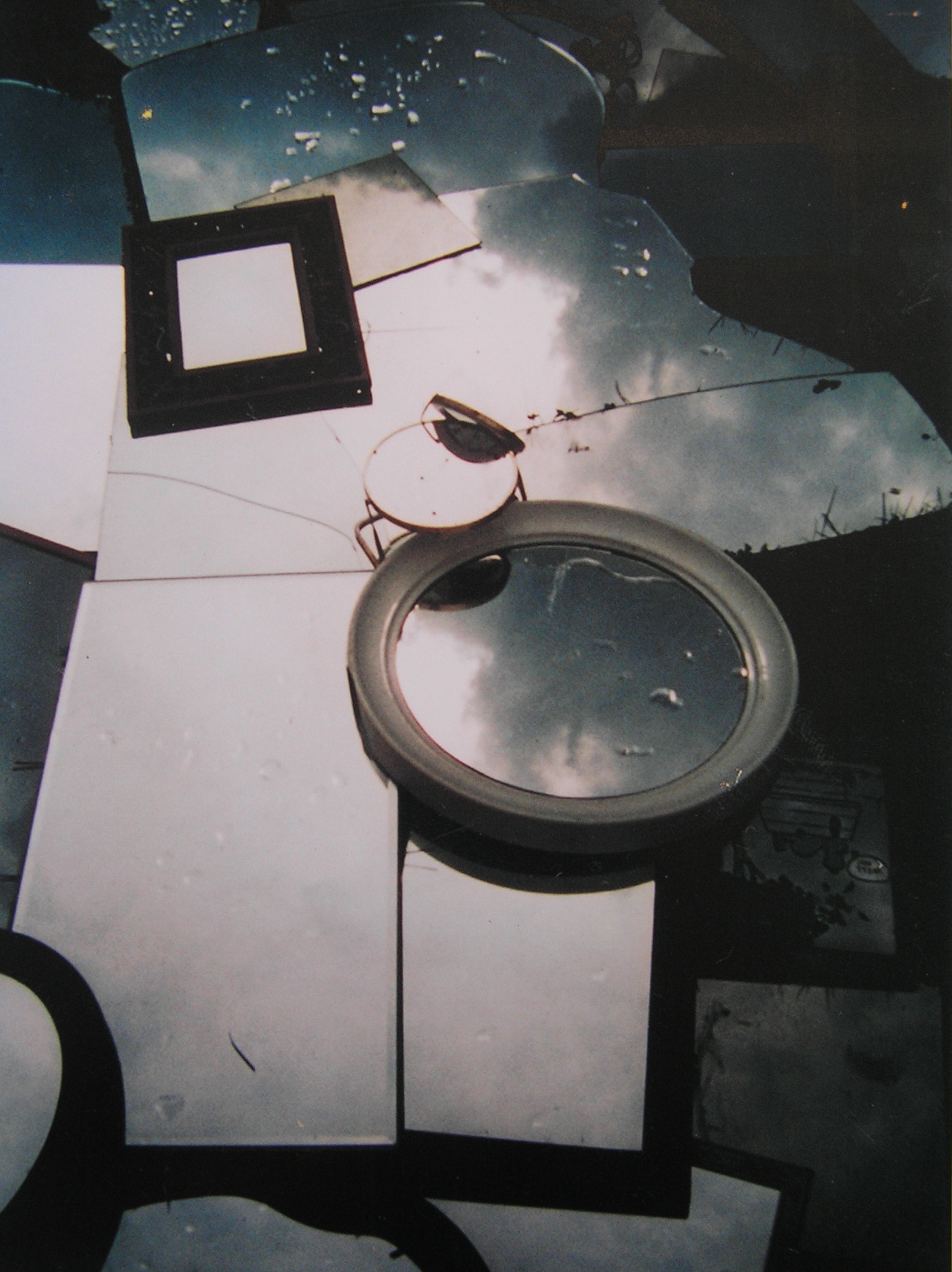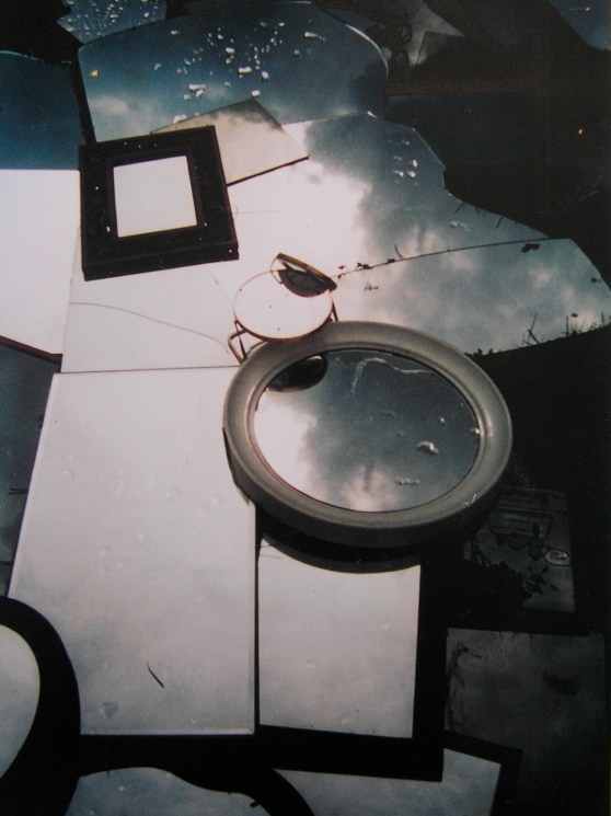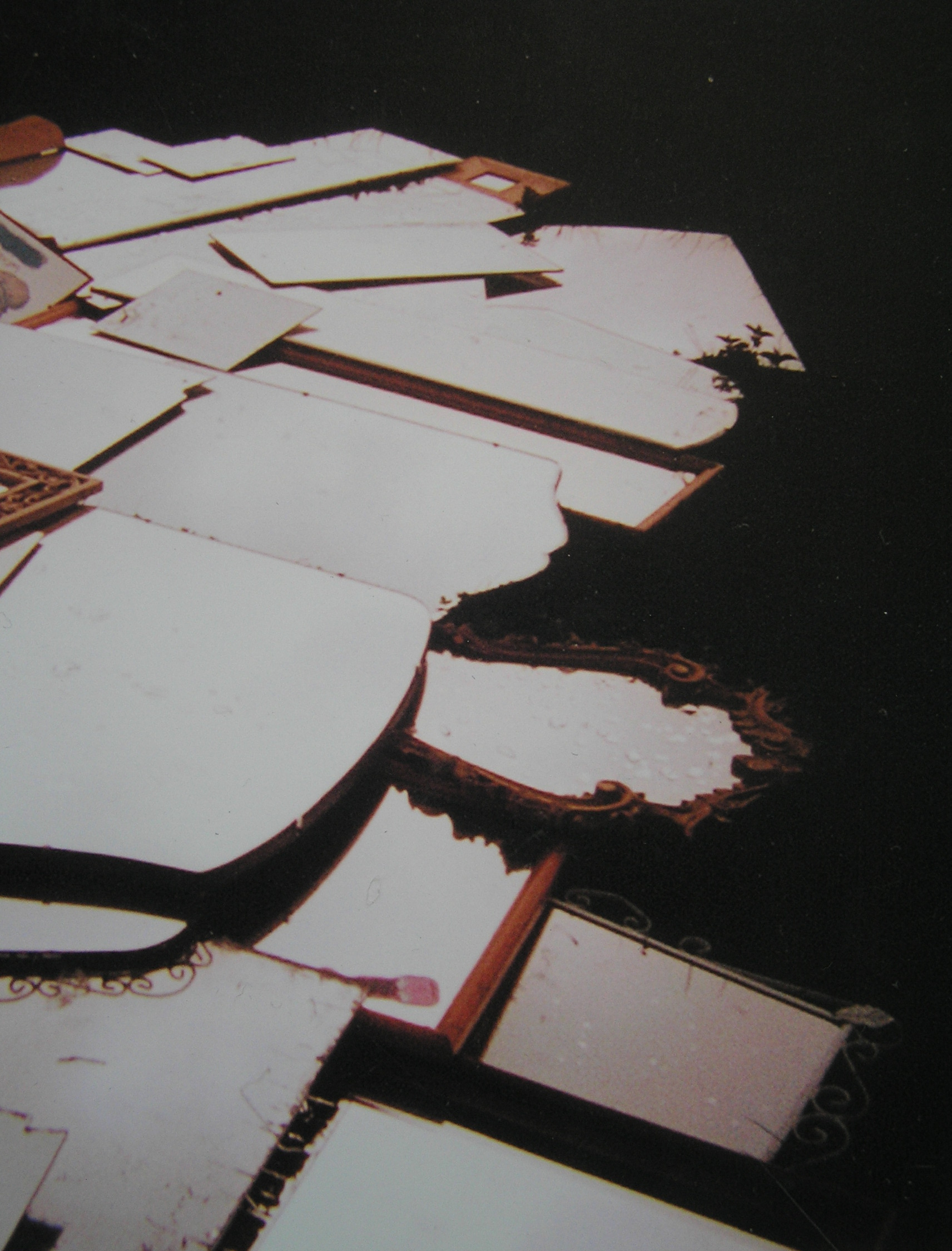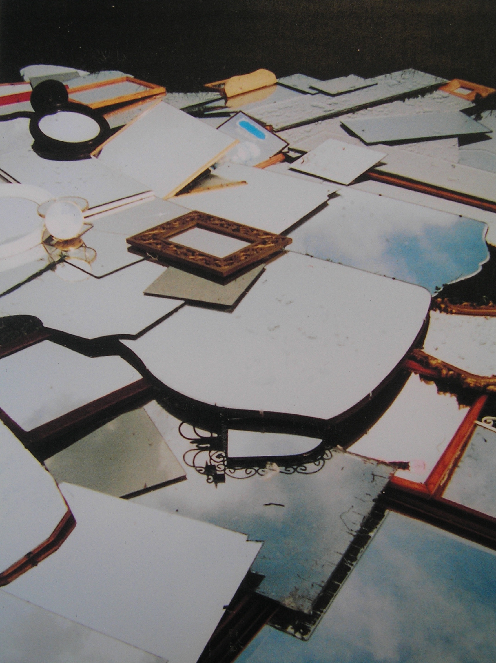Island is an installation comprising a selection of domestic mirrors laid out in a field for viewers to visit in different weather conditions. Ordinarily hanging on a wall in a home in isolation, Mayhew arranged these mirrors together in a group inviting viewers to inspect their reflection, which changed according to the light levels and the weather conditions, through a vehicle (a mirror) that others would see themselves through.