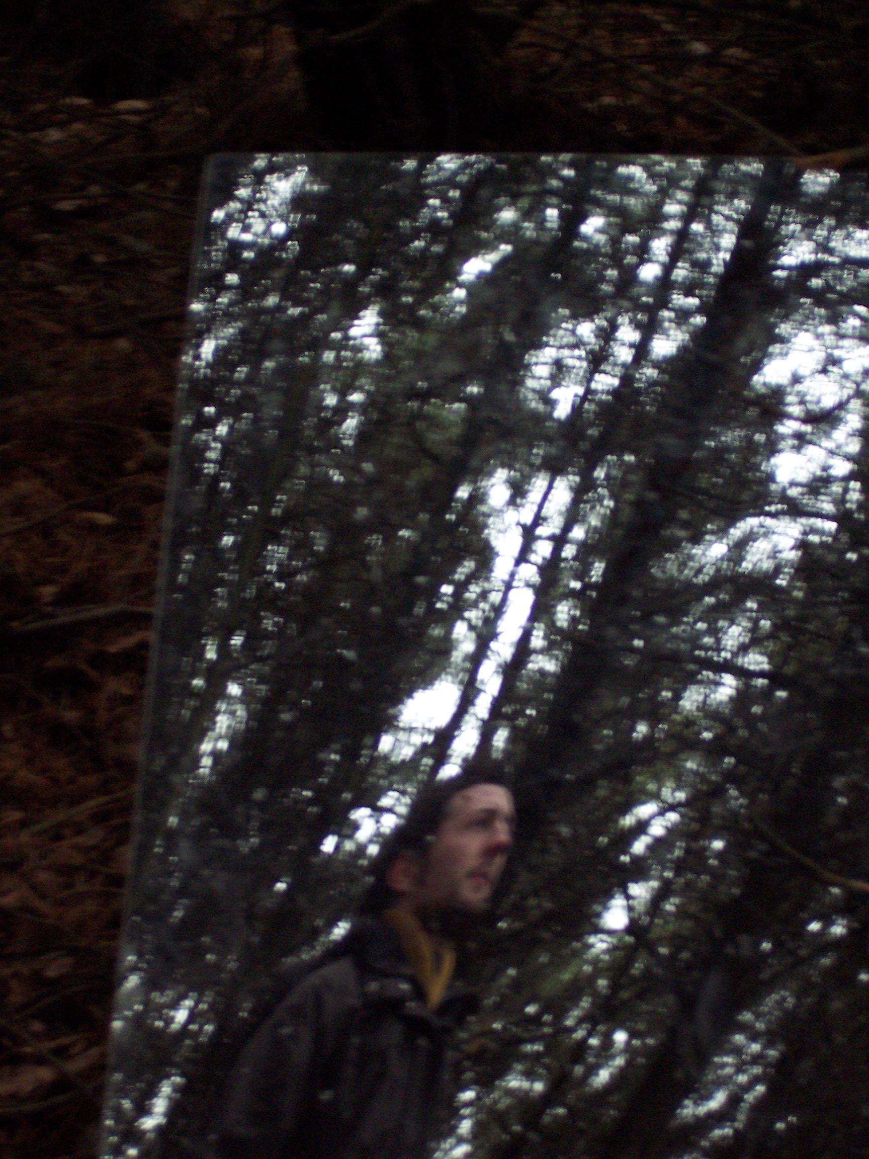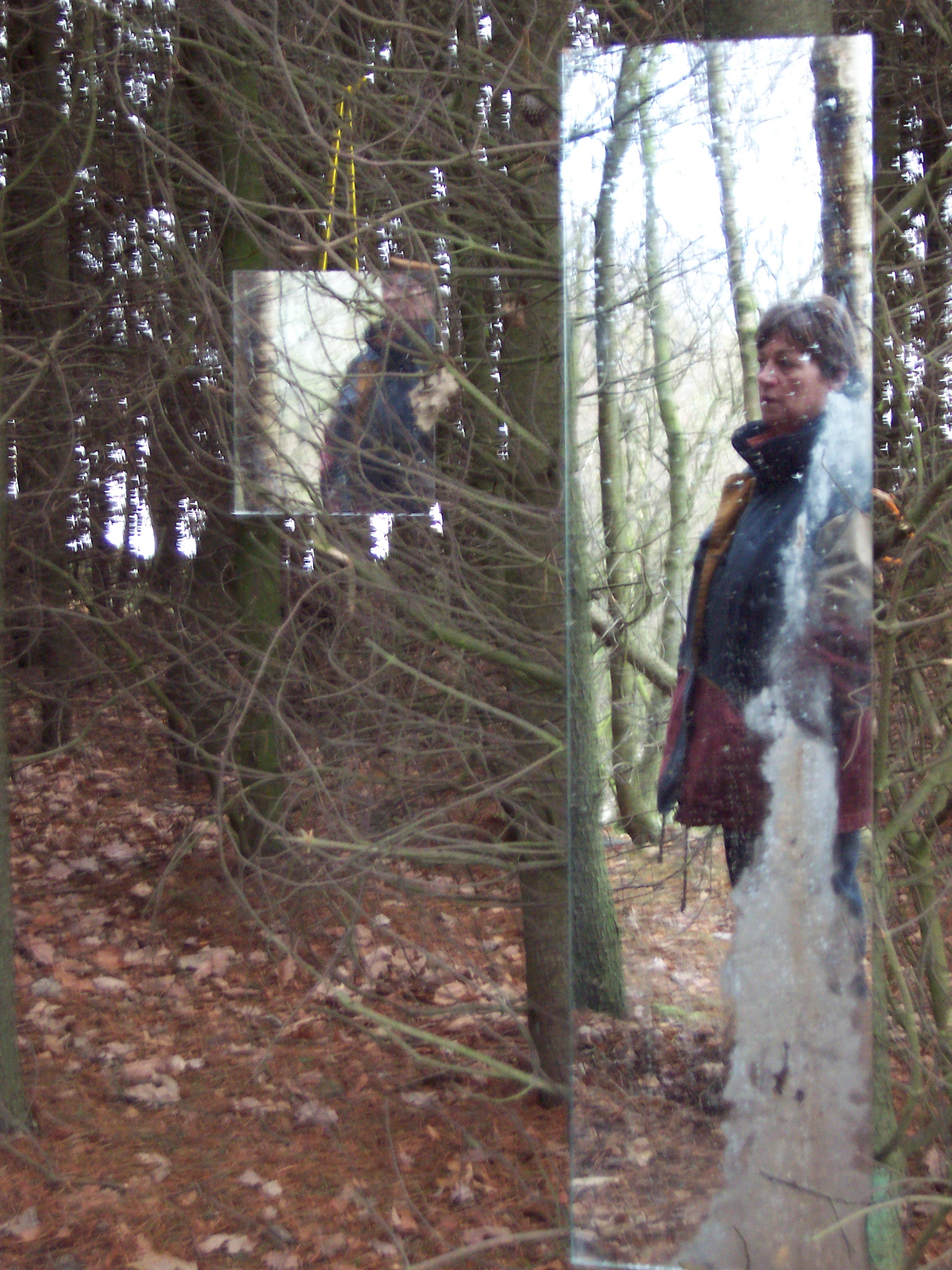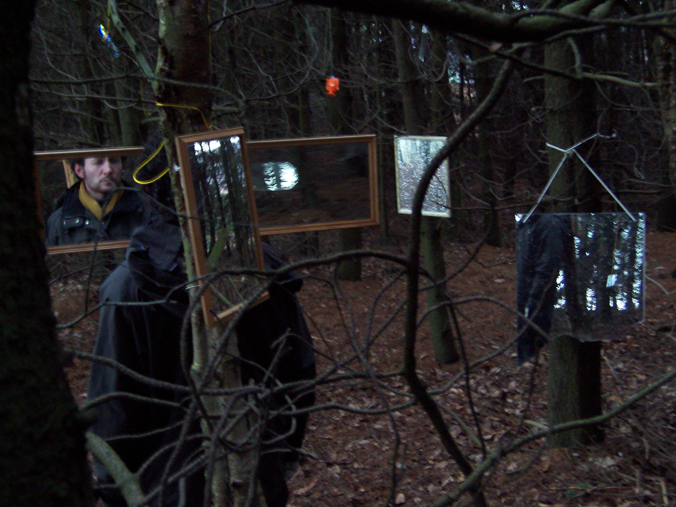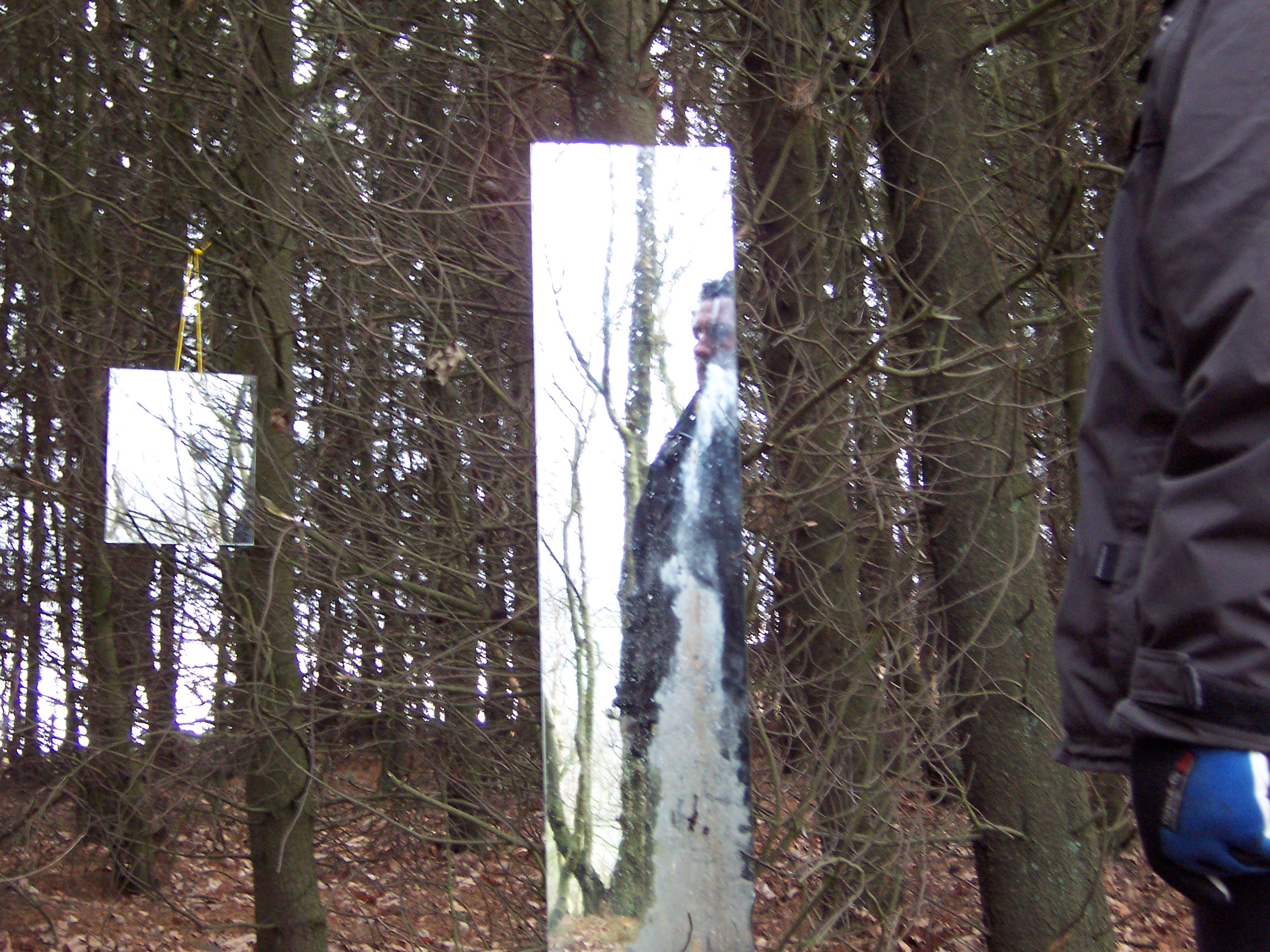 Stood in the center of this opening it was impossible for one’s reflection not to be caught in at least two of the mirrors, and as visitors’ senses became increasingly heightened to their environment so they caught their own fragmented, moving reflections, and the reflection of others in this space. Holding the visitors’ attention were two hyper-real soundscapes also positioned in the clearing. These sounds were those that Mayhew had heard whilst spending time in the clearing, and then recorded at source – the sounds were diverse, some local, others far away: leaves and branches crunching and breaking beneath footsteps, airplanes, lorries and other traffic travelling along a duel-carriageway, birdsong, snippets of conversation etc. The sound sources were concealed, and the wind in this exposed opening often whipped the sound around making it difficult to identify the source, and heightening one’s experience of the surroundings even further, ultimately leading the viewer to a full-length mirror at the edge of the opening. When stood looking at oneself in that full-length mirror one could see, reflected in the background, the various sources of the sounds, if one chose to look beyond oneself and seek to identify them.