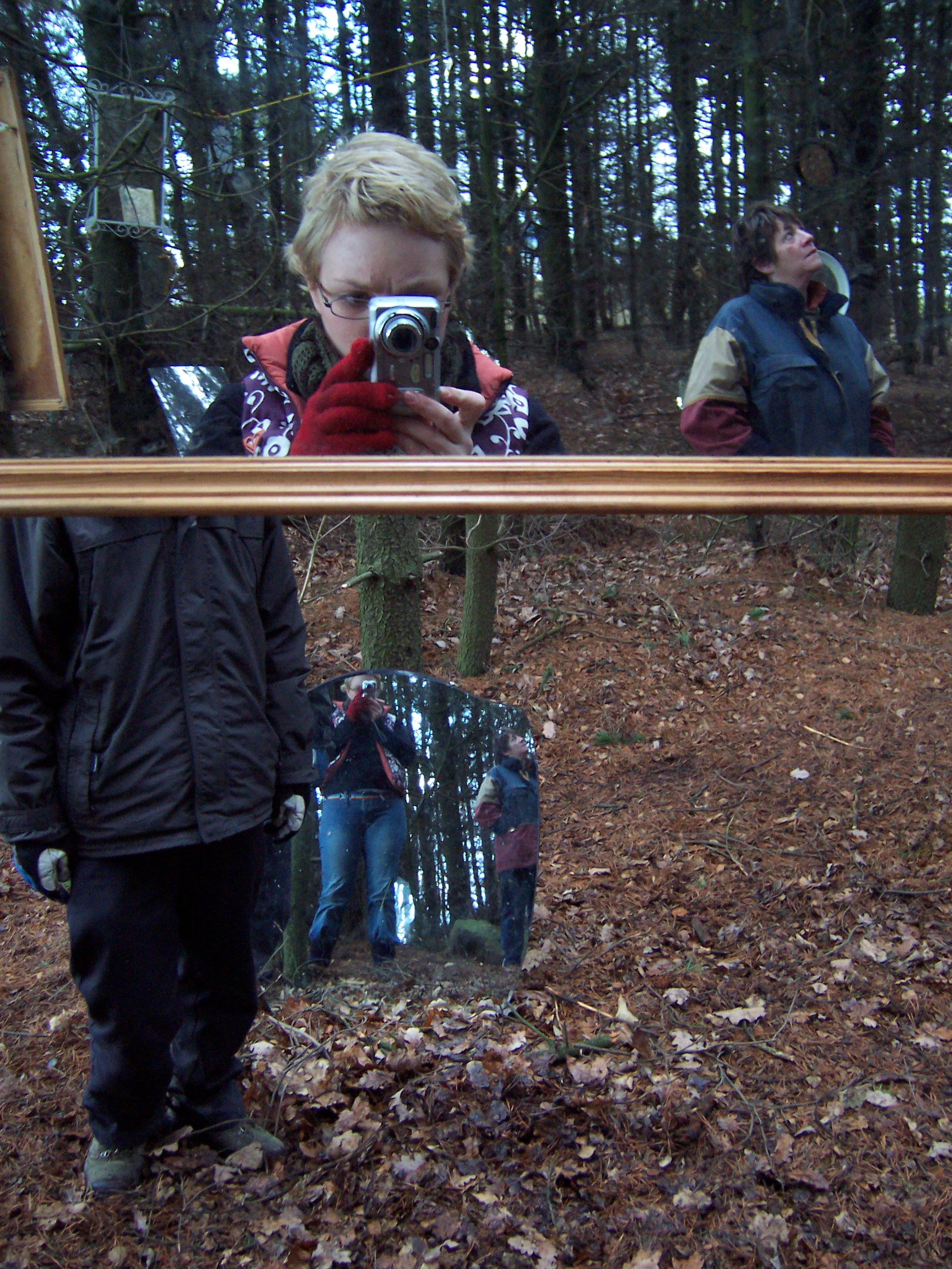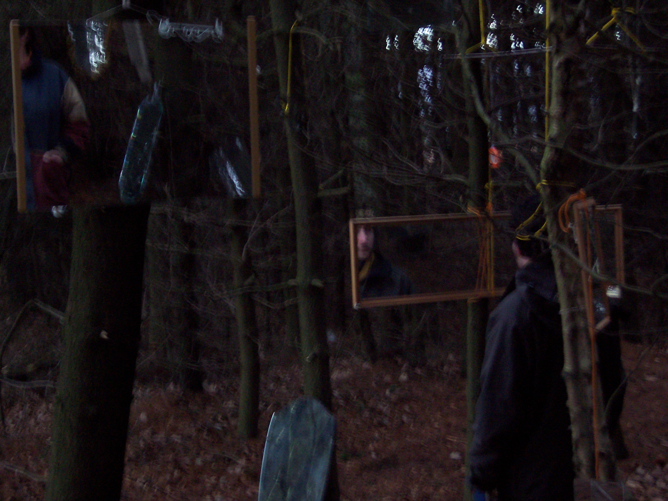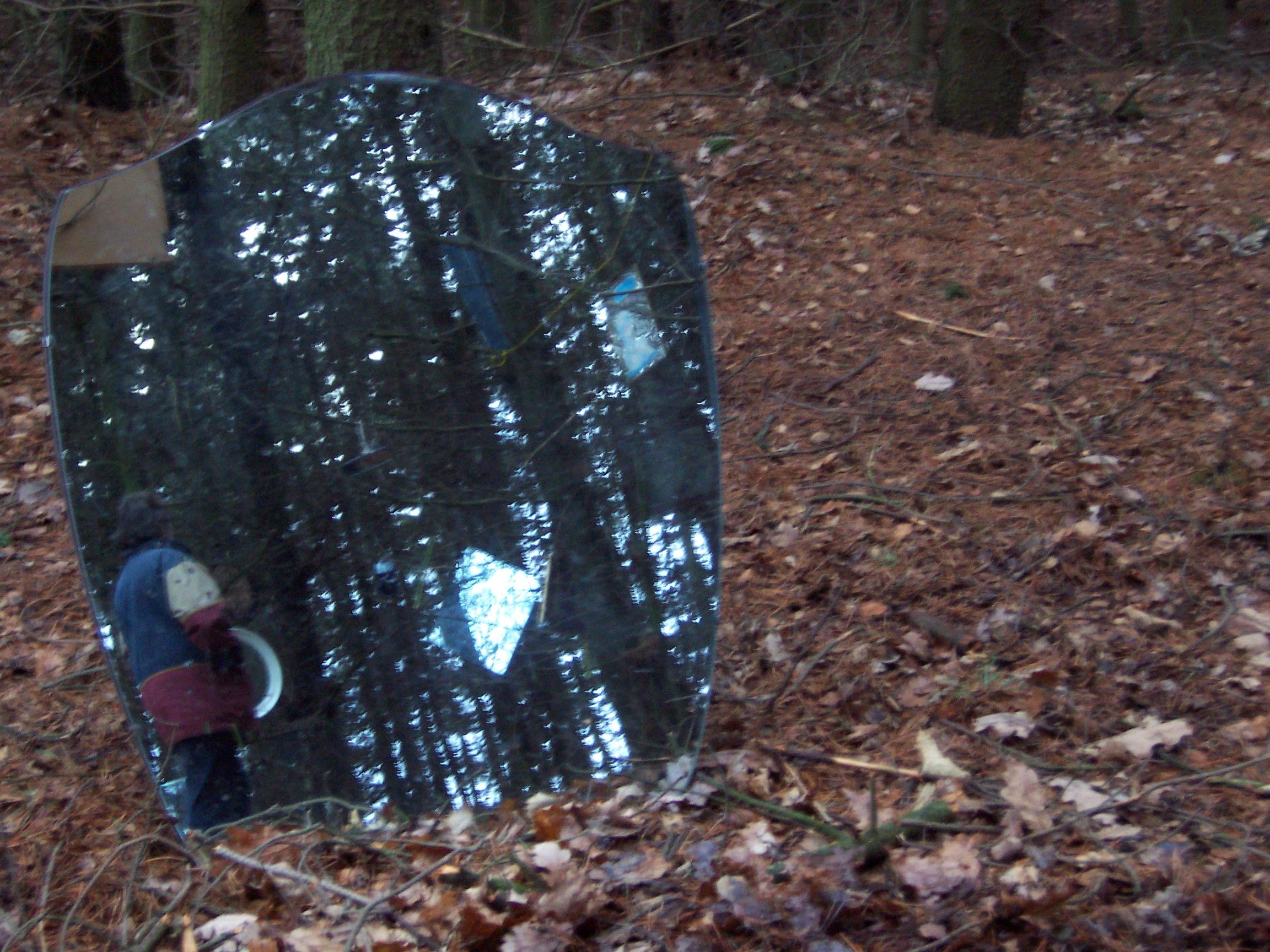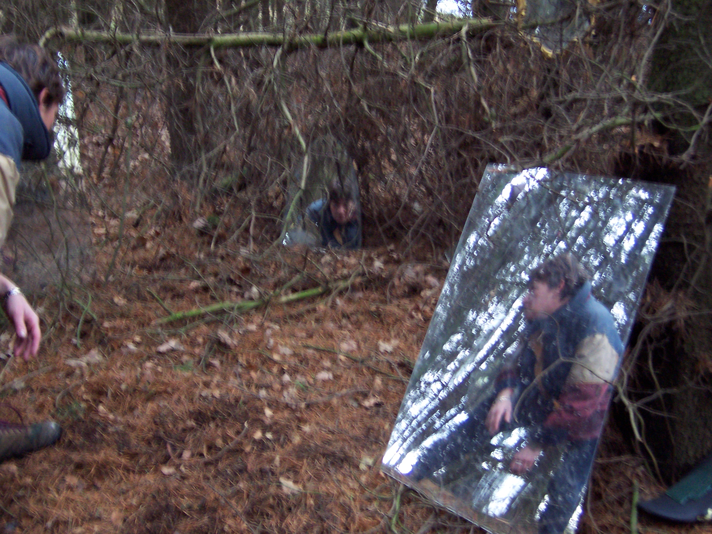 Stood in the center of this opening it was impossible for one’s reflection not to be caught in at least two of the mirrors, and as visitors’ senses became increasingly heightened to their environment so they caught their own fragmented, moving reflections, and the reflection of others in this space. Holding the visitors’ attention were two hyper-real soundscapes also positioned in the clearing. These sounds were those that Mayhew had heard whilst spending time in the clearing, and then recorded at source – the sounds were diverse, some local, others far away: leaves and branches crunching and breaking beneath footsteps, airplanes, lorries and other traffic travelling along a duel-carriageway, birdsong, snippets of conversation etc. The sound sources were concealed, and the wind in this exposed opening often whipped the sound around making it difficult to identify the source, and heightening one’s experience of the surroundings even further, ultimately leading the viewer to a full-length mirror at the edge of the opening. When stood looking at oneself in that full-length mirror one could see, reflected in the background, the various sources of the sounds, if one chose to look beyond oneself and seek to identify them.