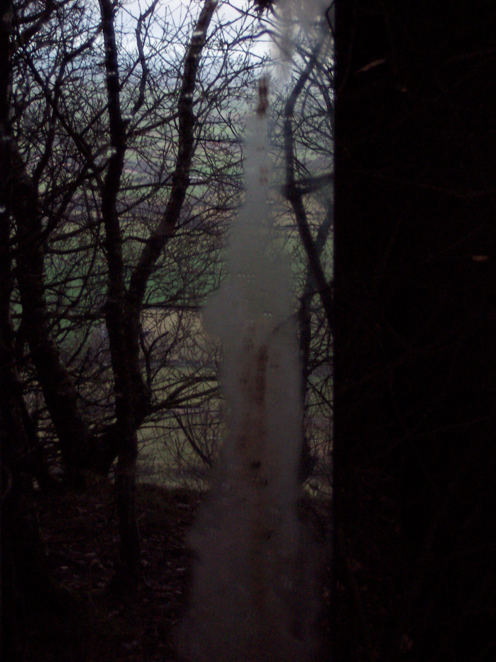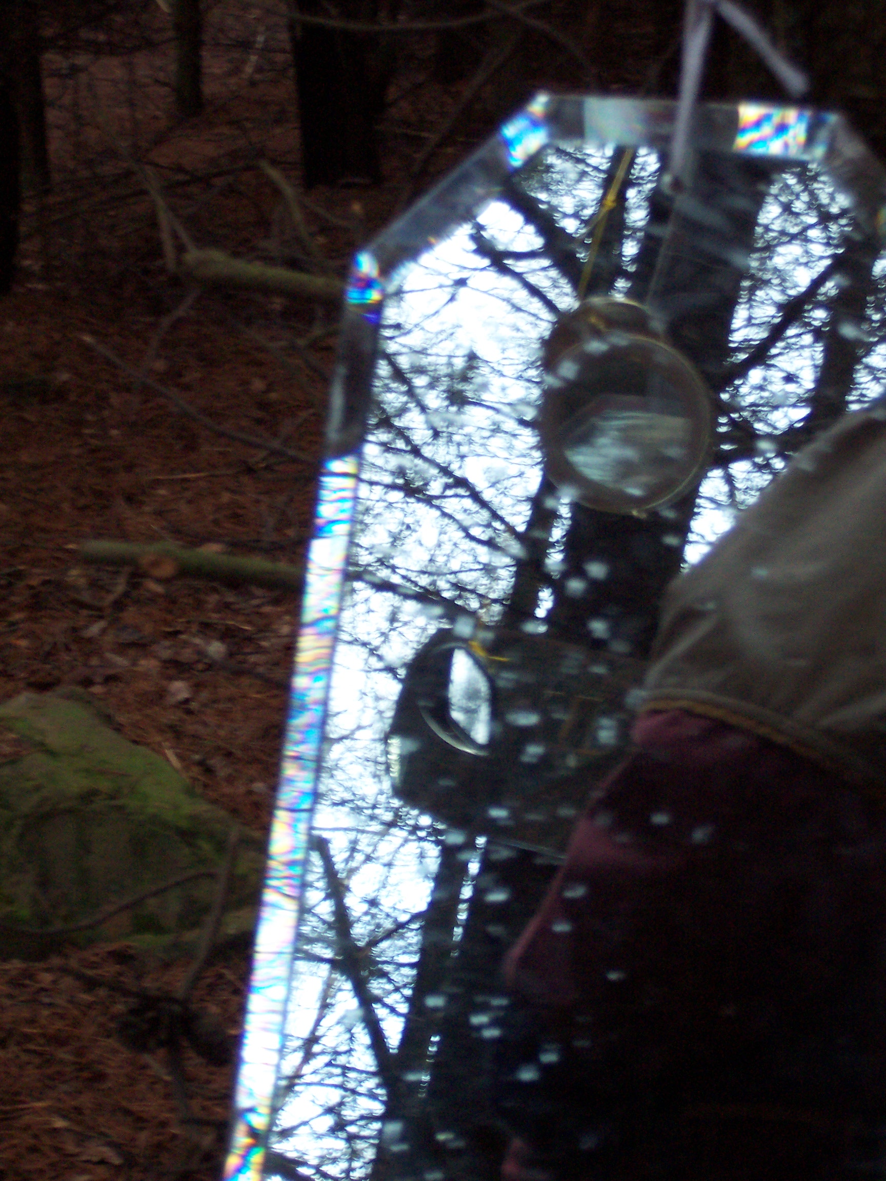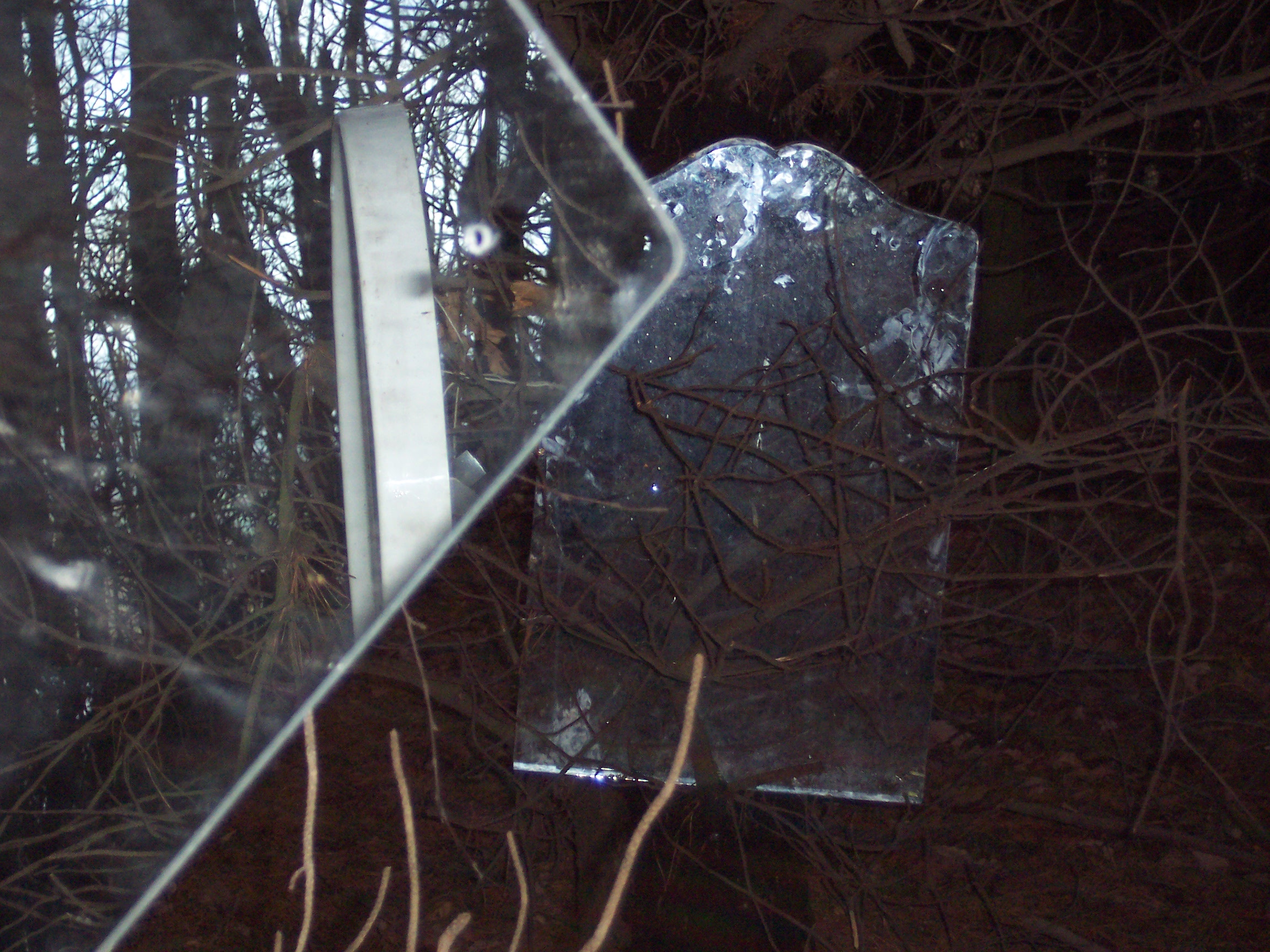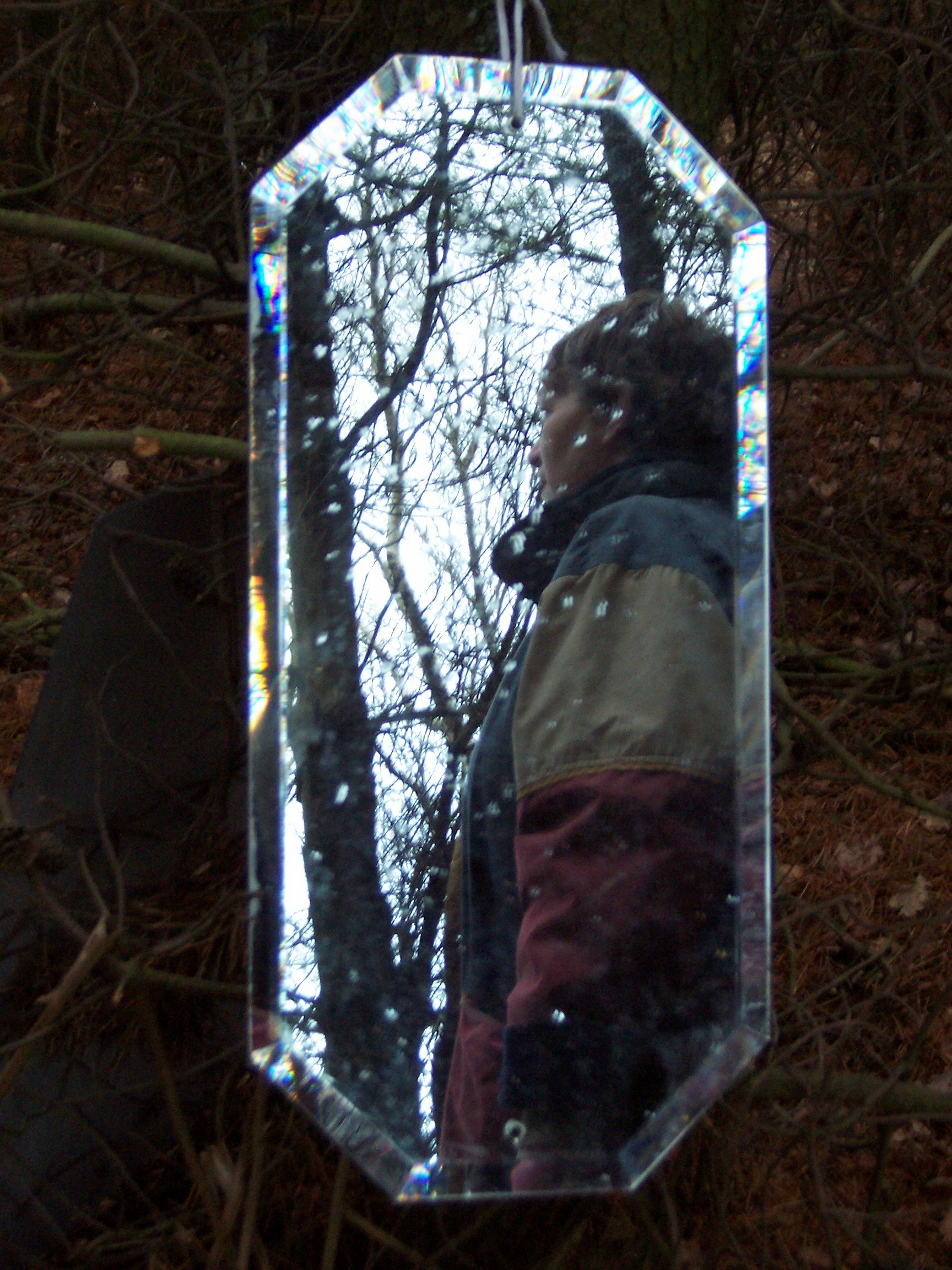 Stood in the center of this opening it was impossible for one’s reflection not to be caught in at least two of the mirrors, and as visitors’ senses became increasingly heightened to their environment so they caught their own fragmented, moving reflections, and the reflection of others in this space. Holding the visitors’ attention were two hyper-real soundscapes also positioned in the clearing. These sounds were those that Mayhew had heard whilst spending time in the clearing, and then recorded at source – the sounds were diverse, some local, others far away: leaves and branches crunching and breaking beneath footsteps, airplanes, lorries and other traffic travelling along a duel-carriageway, birdsong, snippets of conversation etc. The sound sources were concealed, and the wind in this exposed opening often whipped the sound around making it difficult to identify the source, and heightening one’s experience of the surroundings even further, ultimately leading the viewer to a full-length mirror at the edge of the opening. When stood looking at oneself in that full-length mirror one could see, reflected in the background, the various sources of the sounds, if one chose to look beyond oneself and seek to identify them.