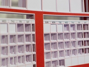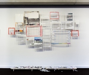 Deconstructing everyday objects, Dupin’s installation at Oxford Central Library comprises of a group of old calendars where all numeric or time references are cut out. What remains, hanging on the wall, is a geometrical patterns of grids, the left over spaces of the days plus the missing parts strewn across the floor.