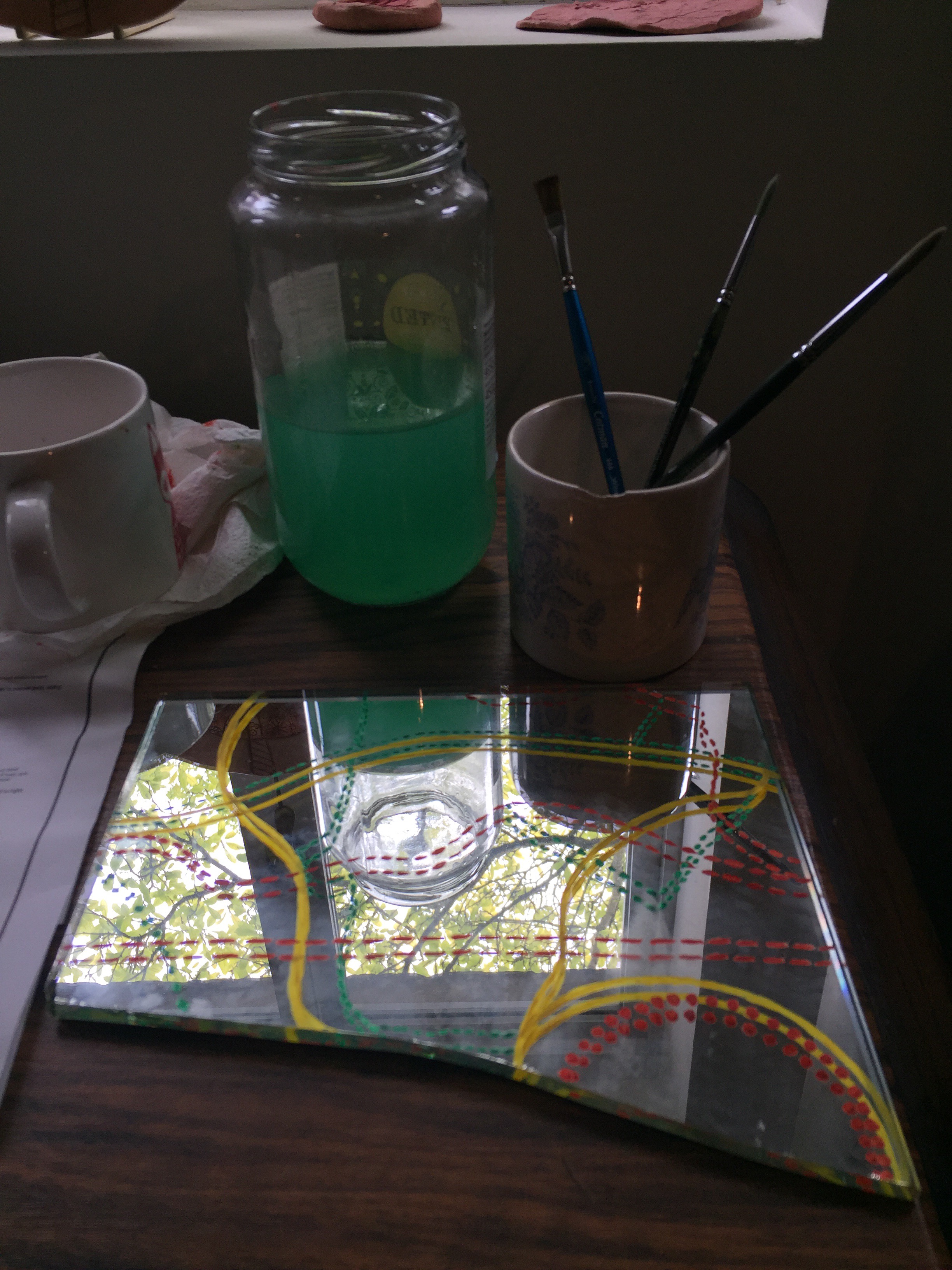 As a continuation of current explorations in mapping I’ve been looking at the ‘Communications’ keys on Ordnance Survey maps; considering again the nature of decision making in life, and how one picks one’s own route through life choosing either to follow specific paths, or go ‘off piste’. Similar to The Natural Course of Things, I’m attempting to highlight the ability, on inability to follow paths according to an ability to read those ‘markers’ that guide the way. In this body of work, however, I’ve chosen to paint imaginary routes, dictated by imaginary landscapes (or voids) that are filled with the viewer’s reflection, by nature of the fact that I am painting on to mirror glass, fractured mirror glass asserting an imperfection or lack of complete control in each piece of work / reflection / route.